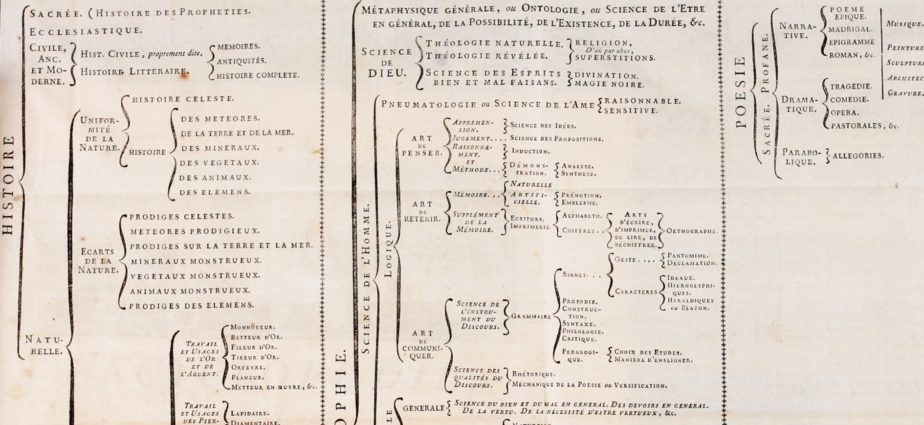 Diderot se beneficia de una triple herencia a la hora de realizar el balance de los conocimientos adquiridos hasta entonces: la de la antigüedad, la de la Europa medieval y la del Humanismo renacentista. Con la Enciclopedia se compromete a dar sentido a este mundo a través del dominio de las técnicas que permitirán transformarlo: las maravillas de este mundo, ya no son los fenómenos naturales que podemos admirar pasivamente, sino los productos de nuestro genio.